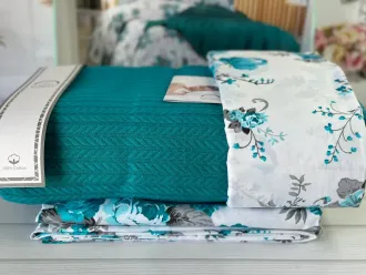 Літній набір постільної білизни Romeo Home (Туреччина) з в'язаним пледом. Простирадло та наволочки — 100% бавовна (ранфорс). Плед машинної в'язки 220х230 см. Євро розмір. Подарункова упаковка.