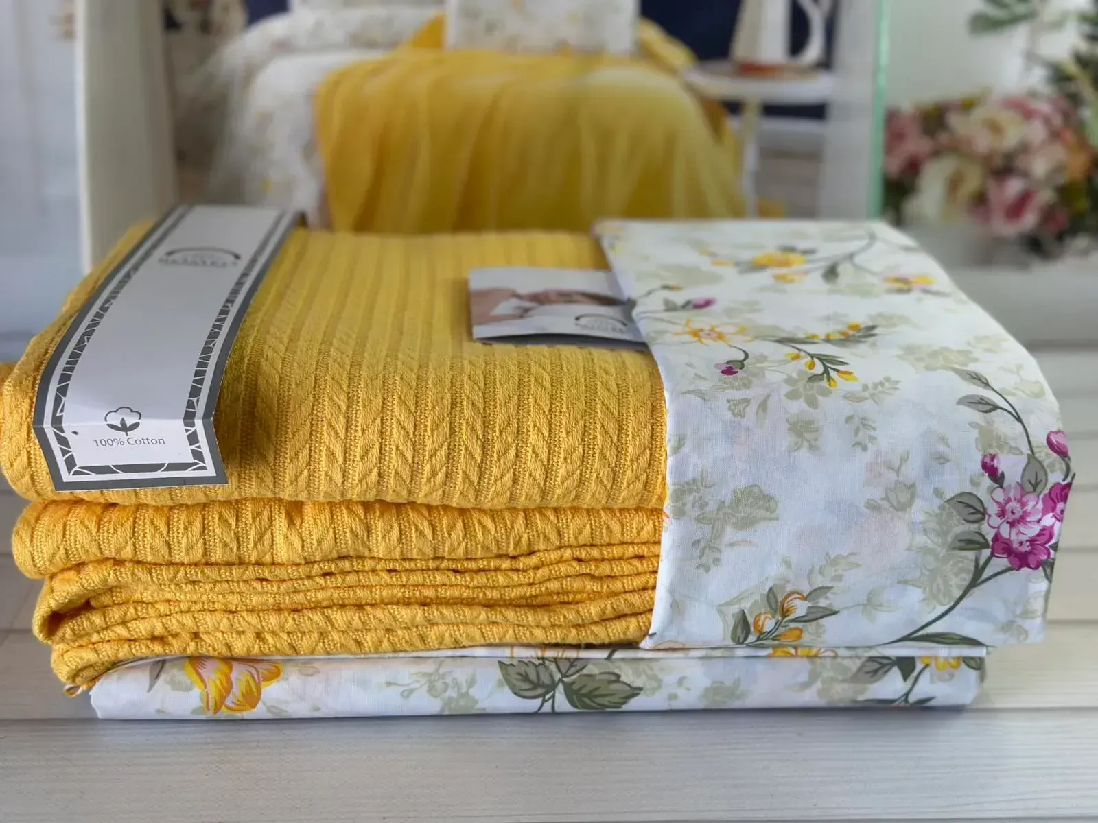 Літній набір постільної білизни Romeo Home (Туреччина) з в'язаним пледом. Простирадло та наволочки — 100% бавовна (ранфорс). Плед машинної в'язки 220х230 см. Євро розмір. Подарункова упаковка.