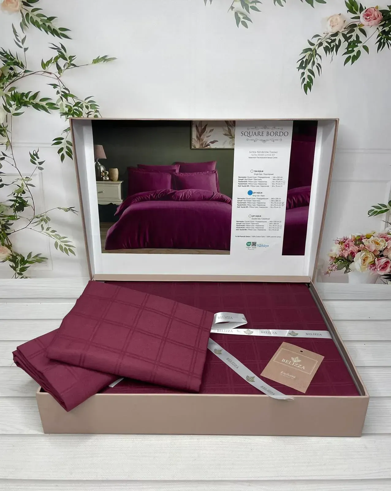 Постільна білизна Belizza Square Bordo Євро розміру. Тканина: жаккард (100% бавовна). У комплекті 4 наволочки (50х70 та 70х70 см) та велике простирадло 240х260 см. Виробництво Туреччина. Насичений бордовий колір, геометричний візерунок, фірмова подарункова упаковка.