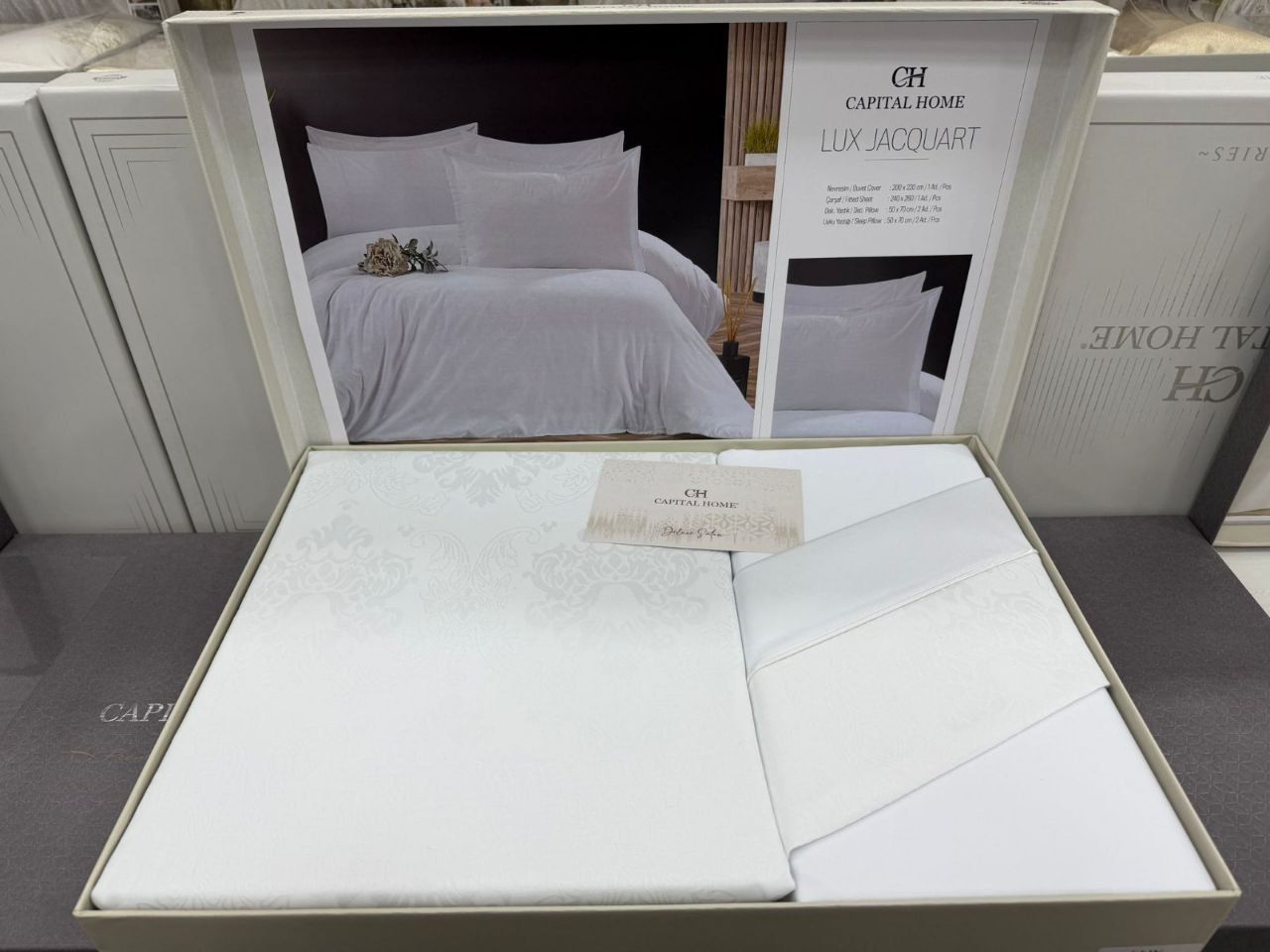 Ексклюзивна колекція євро комплектів Capital Home Lux Jacquard. Виготовлена з елітного сатин-жакарду (100% бавовна Deluxe) високої щільності 300 TC. Класичний дамаський візерунок витканий безпосередньо у структурі тканини, що створює розкішну гру світла та об'ємну фактуру. Колекція представлена у п'яти благородних відтінках: White (Білий), Cream (Кремовий), Beige (Бежевий), Vizon (Тауп) та Grey (Сірий).