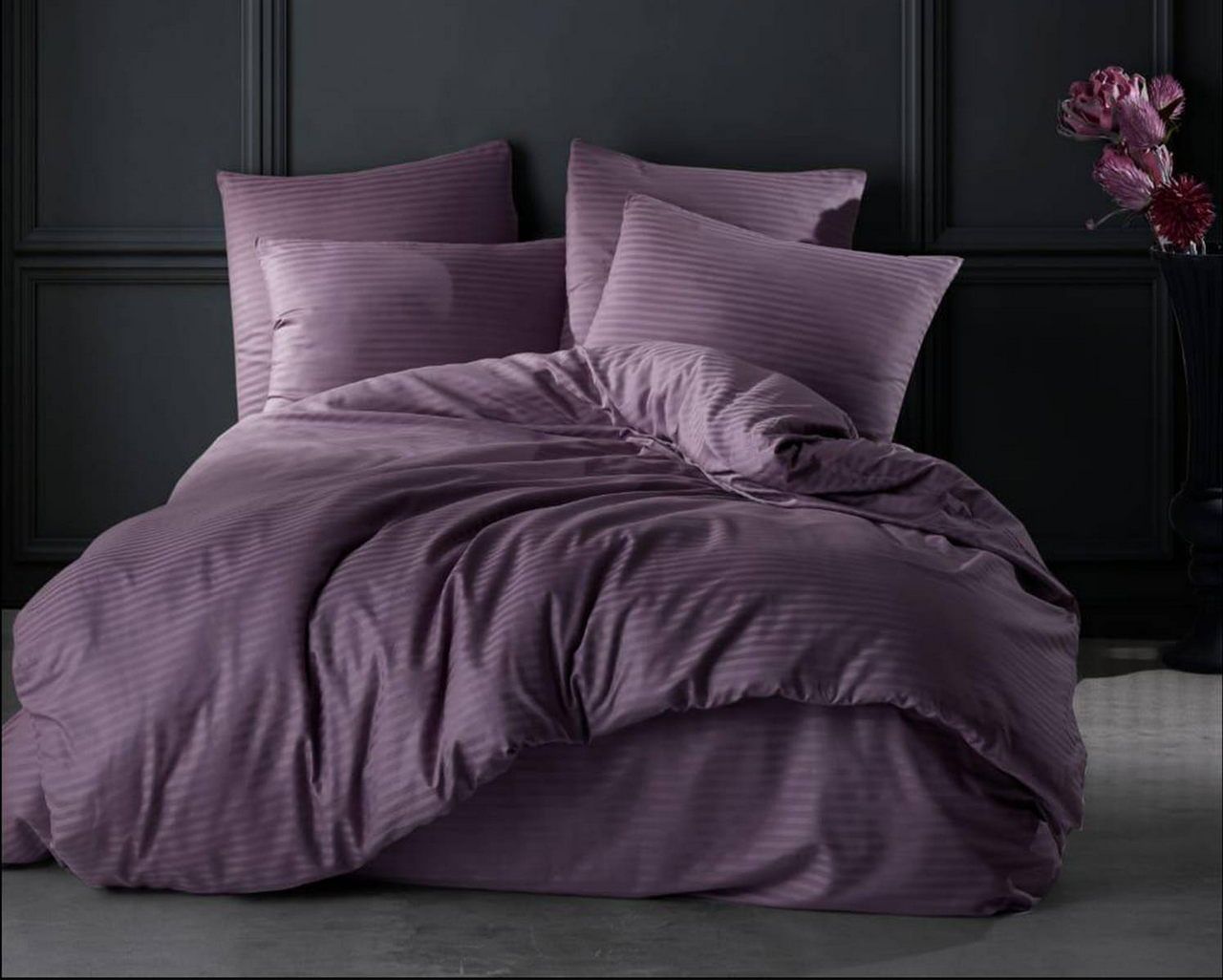 Ексклюзивний євро комплект Charlotte Stripe Satin з простирадлом на гумці. Рідкісна комплектація з фіксованим простирадлом розміру 180х200 см (+30 см борт). Виготовлений з натурального страйп-сатину (100% бавовна) — тканини з ефектом чергування матових та глянцевих смуг.