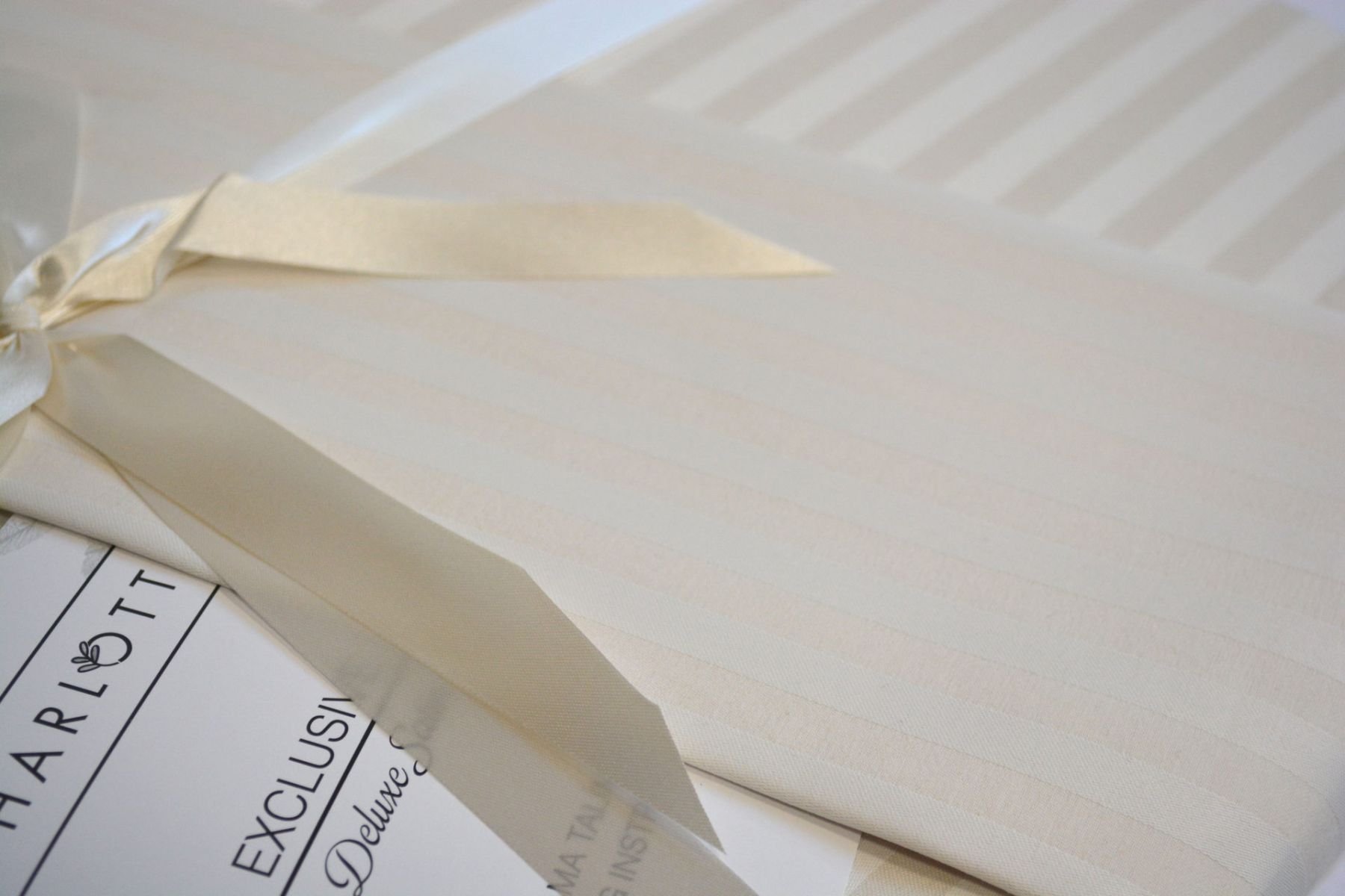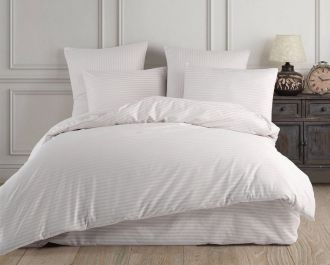 Ексклюзивний євро комплект Charlotte Stripe Satin з простирадлом на гумці. Рідкісна комплектація з фіксованим простирадлом розміру 180х200 см (+30 см борт). Виготовлений з натурального страйп-сатину (100% бавовна) — тканини з ефектом чергування матових та глянцевих смуг.