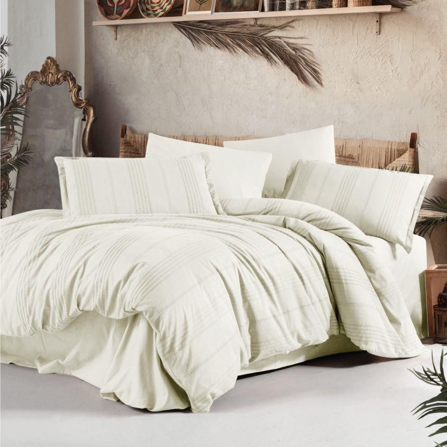 Ексклюзивна постільна білизна Clasy V5 Ekru у розмірі Євро. Новинка 2025 року — тканина Ранфорс Жаккард (100% бавовна). Поєднує м'якість бавовни та вишукану рельєфну текстуру. У комплекті підковдра 200х220 см та велике простирадло 240х260 см. Виробництво Туреччина. Елегантний кремовий колір, шикарна якість.