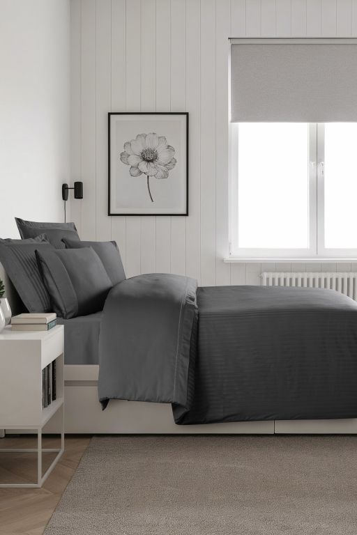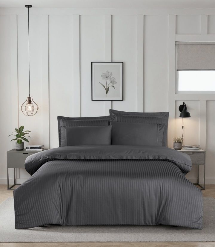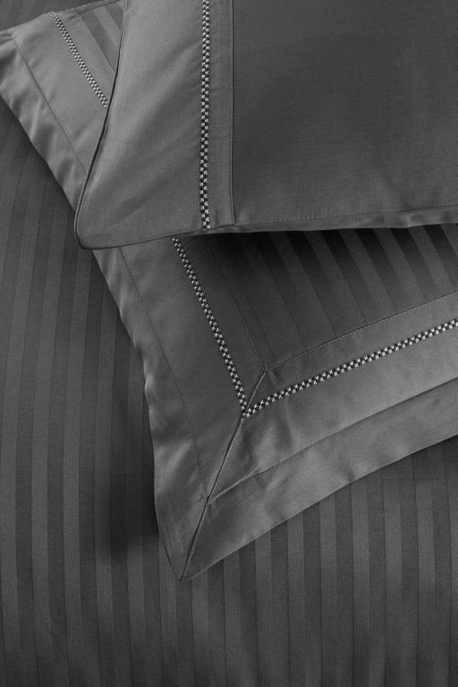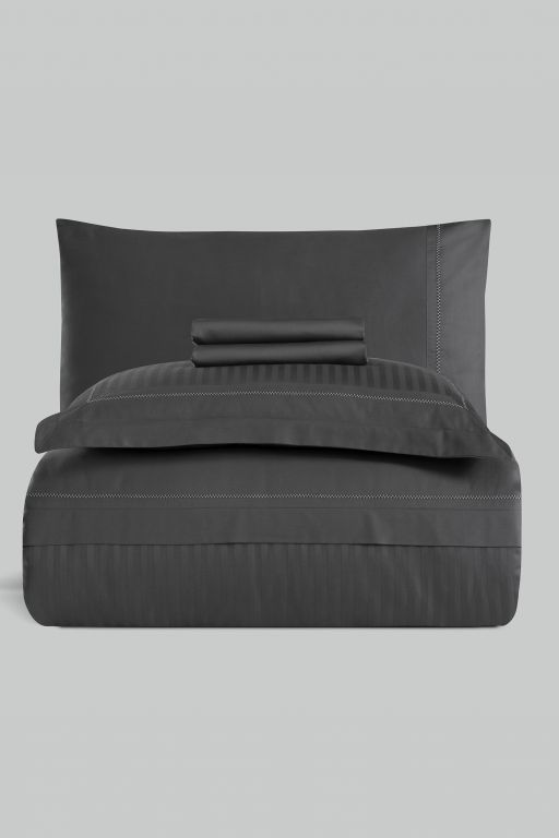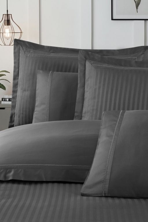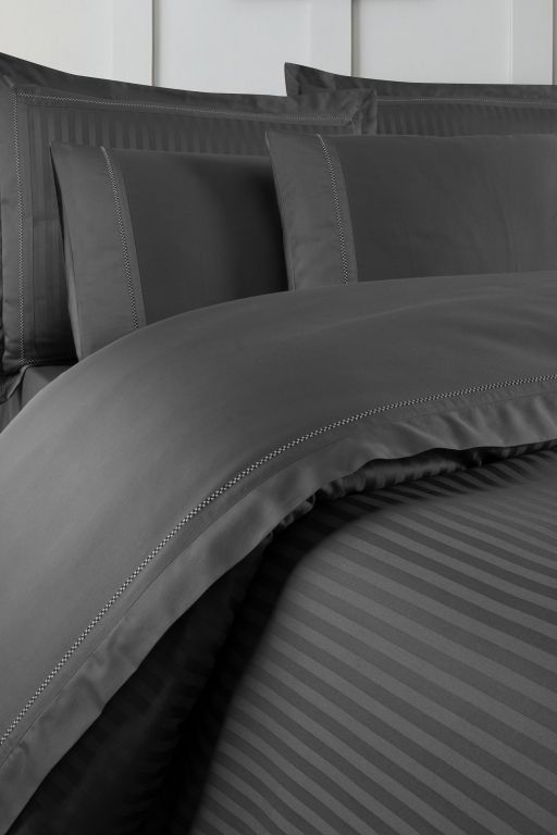Статусний комплект La Romano Mona Orcella Grey у глибокому темно-сірому кольорі (антрацит). Пошитий з преміального страйп-сатину. Дизайн доповнений елегантною декоративною вишивкою. Тканина — Сатин Делюкс найвищої щільності (300 TC).