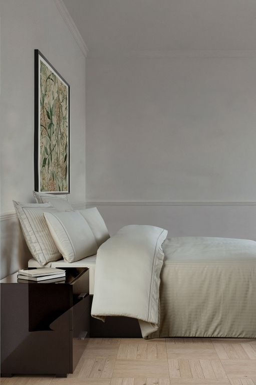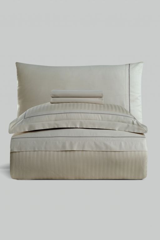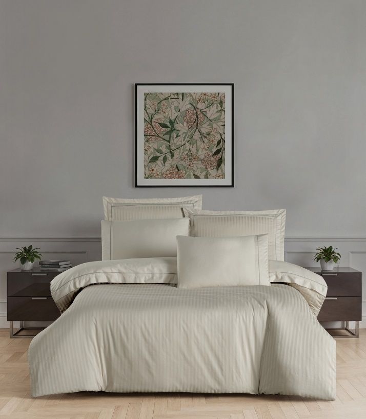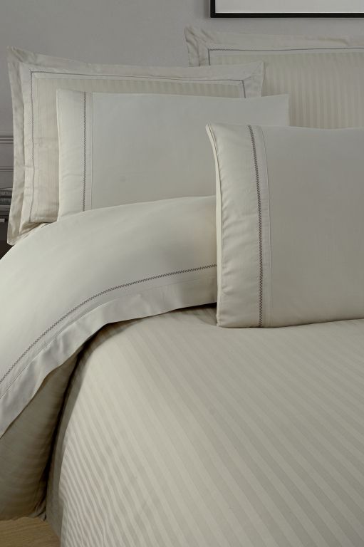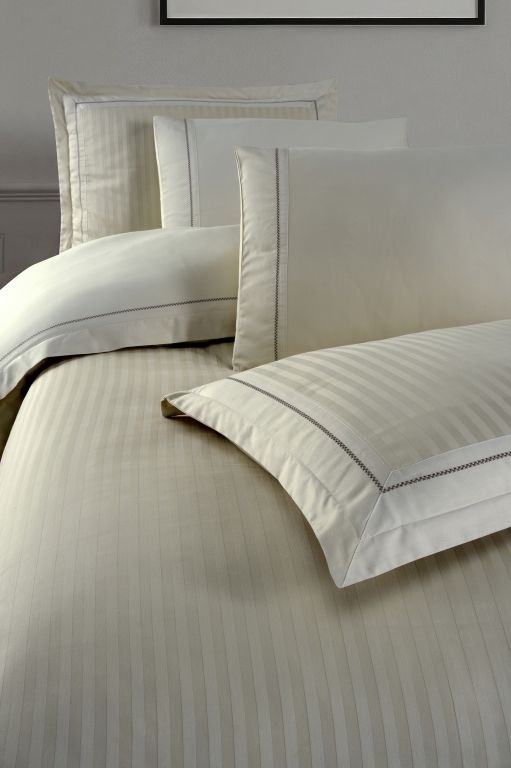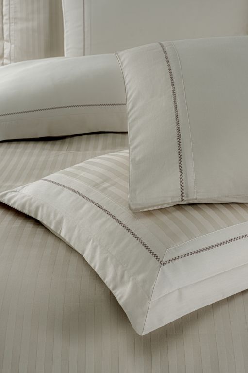 Елегантний євро комплект La Romano Mona Orcella Wind у кольорі "Wind" (теплий кремовий беж). Виготовлений з розкішного страйп-сатину. Оздоблений фірмовою декоративною вишивкою-рамкою. Тканина — Сатин Делюкс найвищої щільності (300 TC).