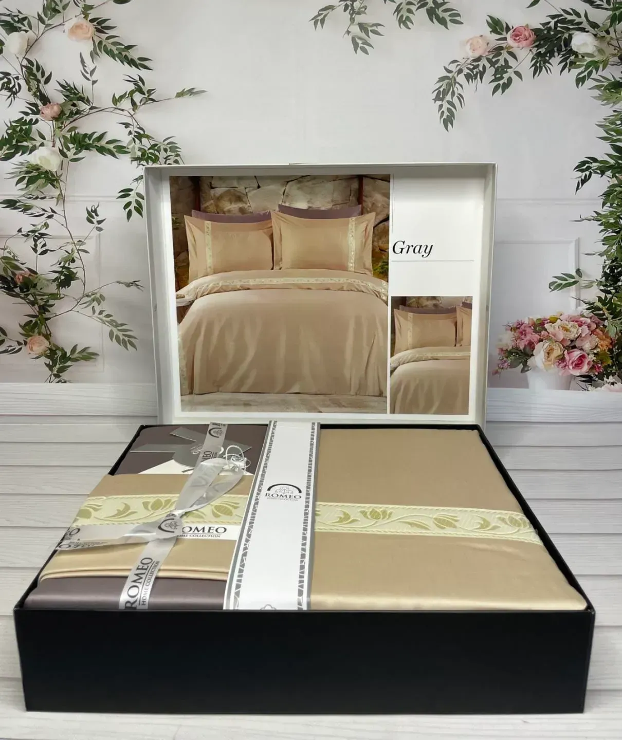 Елітна постільна білизна Romeo Home Gray Євро розміру. Тканина: Сатин Делюкс (100% бавовна), щільність 300 TC. У комплекті підковдра 200х220 см та велике простирадло 240х260 см. Виробництво Туреччина. Стильний сірий колір, витончена вишивка, преміальна подарункова упаковка.