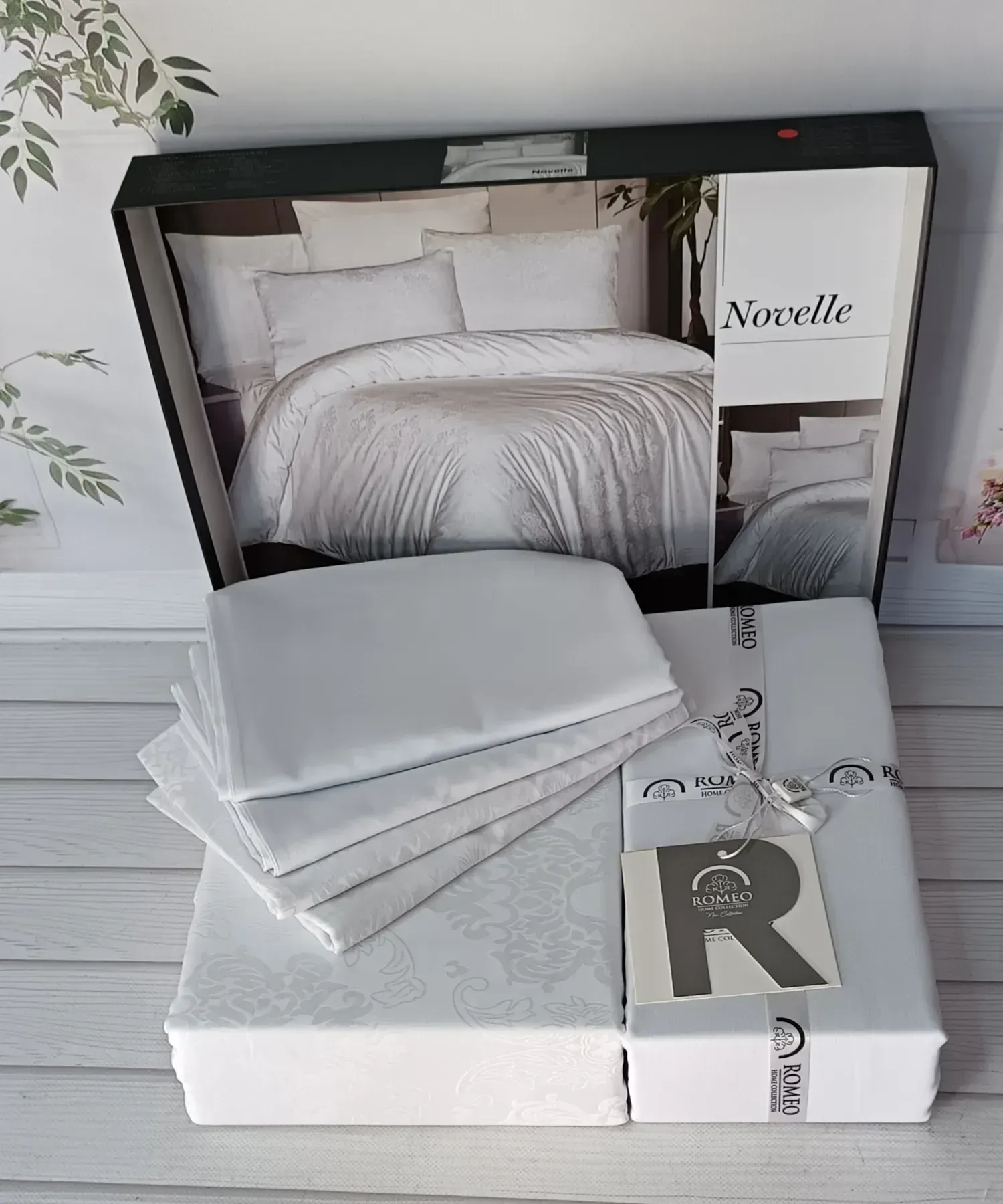 Постільна білизна Romeo Home Novelle White Євро розміру. Тканина: сатин-жаккард (100% бавовна), щільність 220 TC. Комплект з 4 наволочками та великим простирадлом 240х260 см. Виробництво Туреччина. Сліпучо-білий колір, вишукане пакування у подарункову коробку.
