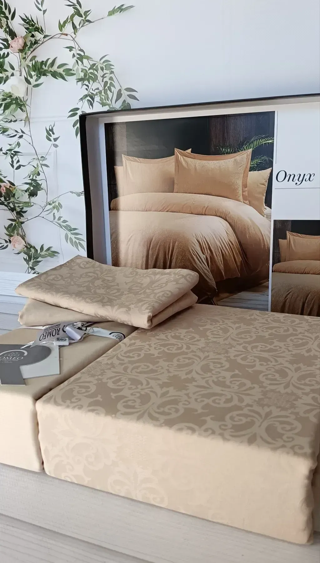 Постільна білизна Romeo Home Onyx Kahve Євро розміру. Тканина: сатин-жаккард (100% бавовна), щільність 220 TC. Комплект з 4 наволочками та великим простирадлом 240х260 см. Виробництво Туреччина. Насичений кавовий колір, жакардовий візерунок, преміальна подарункова коробка.
