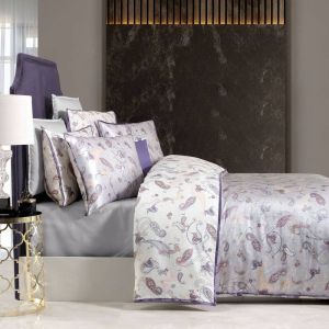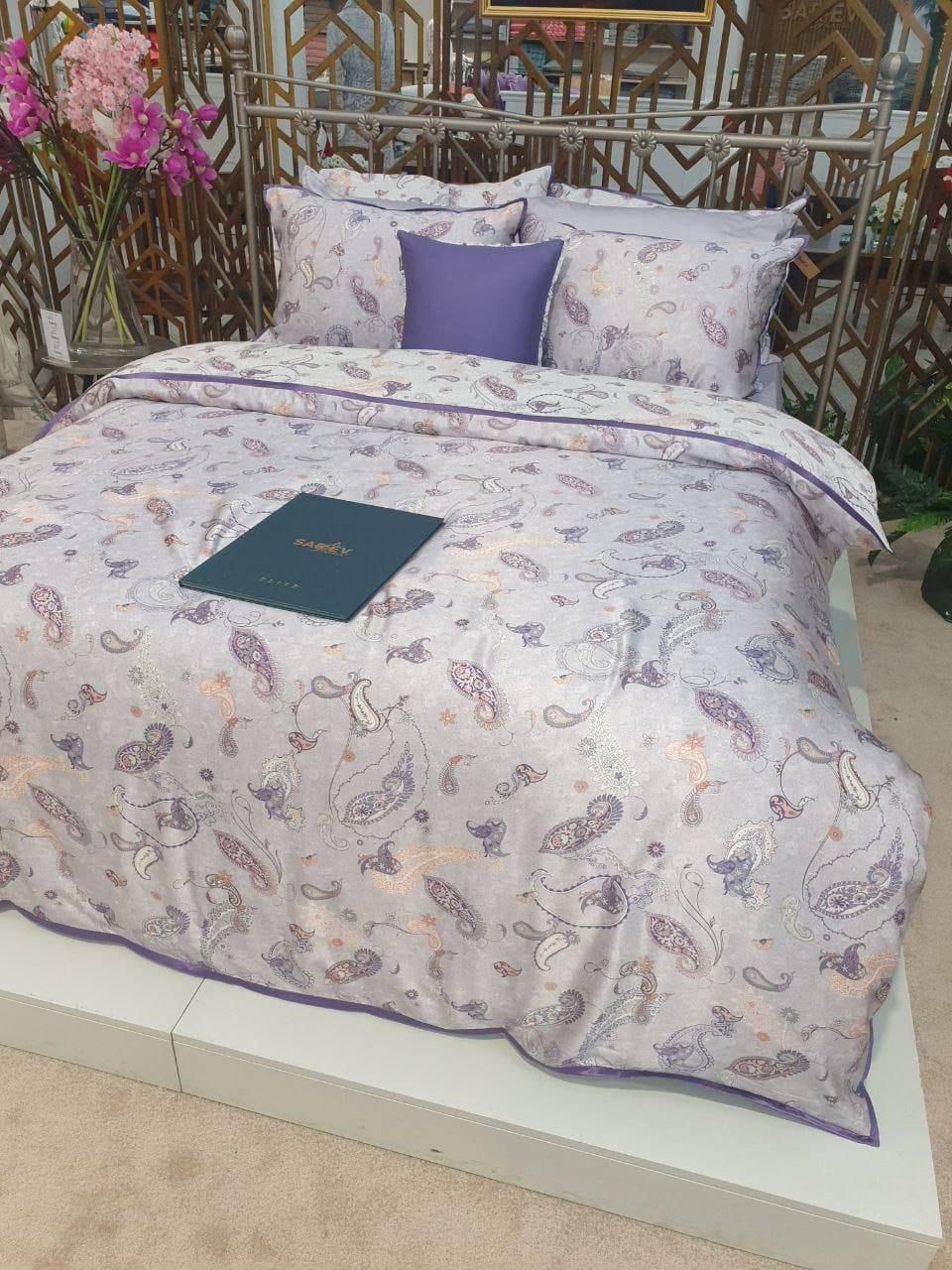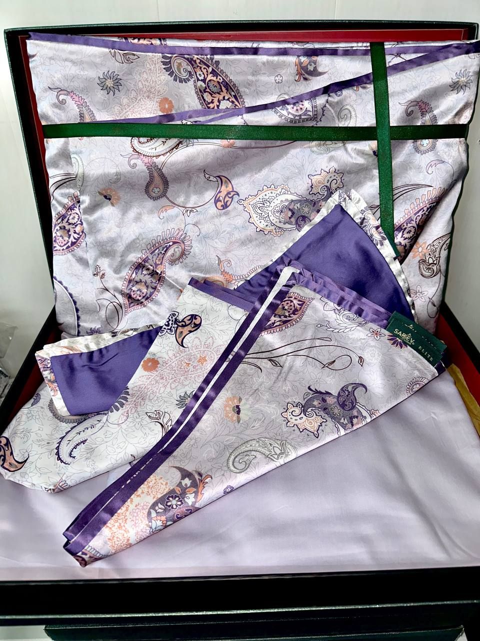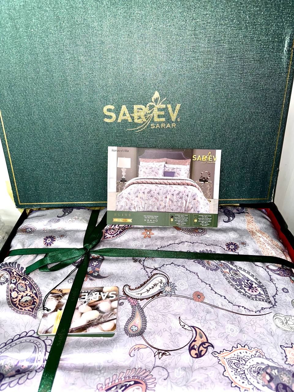 Sarev Ikarus Lila — сатин Делюкс із натуральним шовком, 500 ТС, лавандовий орнамент пейслі, OEKO-TEX, преміум-якість і подарункова упаковка.