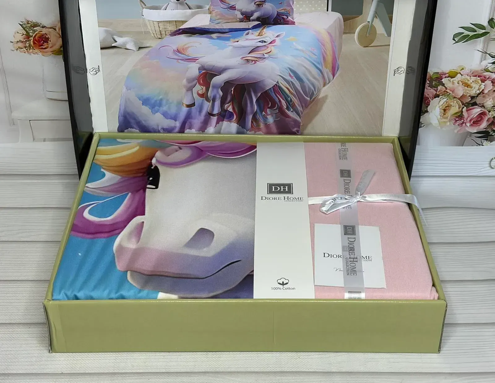 Дитяча постільна білизна Romeo Home Edinorog. Односпальний комплект (ранфорс, 100% бавовна). Туреччина. Двостороння підковдра 160х220 см з єдинорогами, велике простирадло 160х240 см. Подарункова коробка.