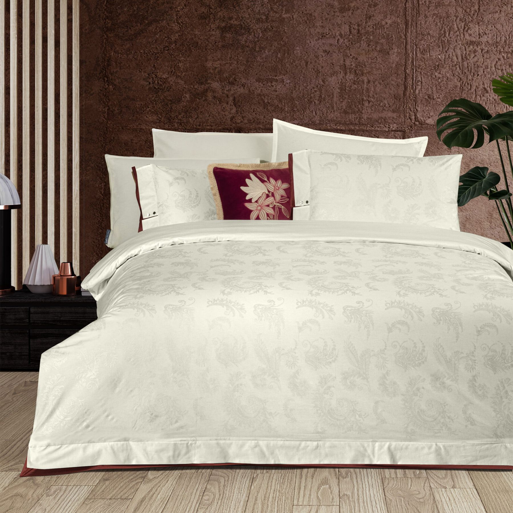Преміальний сімейний комплект Sarev Bimala Fancy Ecru. Виготовлений зі 100% високоякісної бавовни з інноваційною обробкою Sanforized (захист від усадки). Вишуканий дизайн у відтінку екрю з ніжним орнаментом та контрастним бордовим кантом. Укомплектований двома підковдрами для максимального комфорту пари.