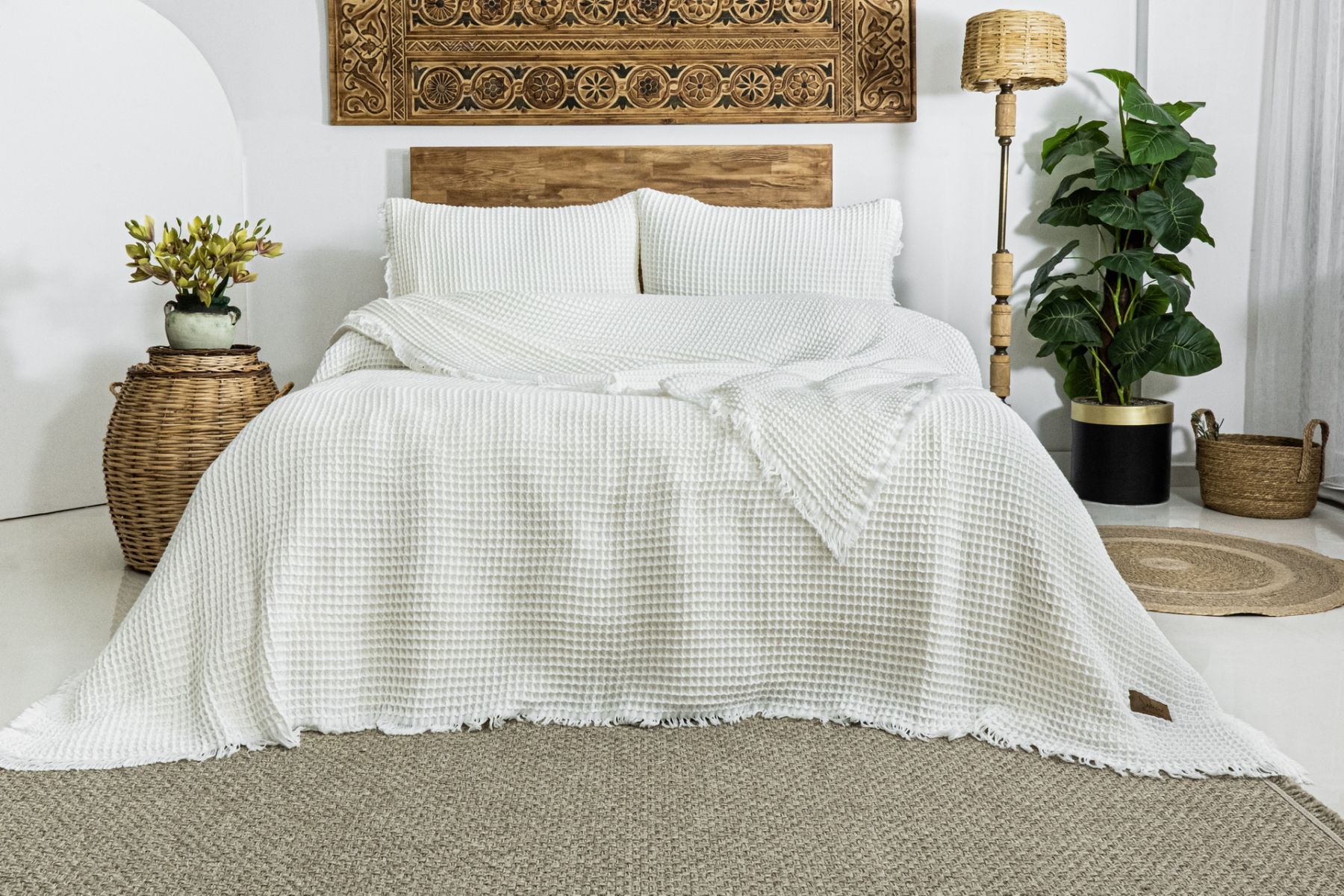 Вафельне покривало Saheser Norah Cream (240x260) з наволочками. 100% бавовна, колір айворі, стильна бахрома. Натуральний текстиль із Туреччини для світлої спальні.