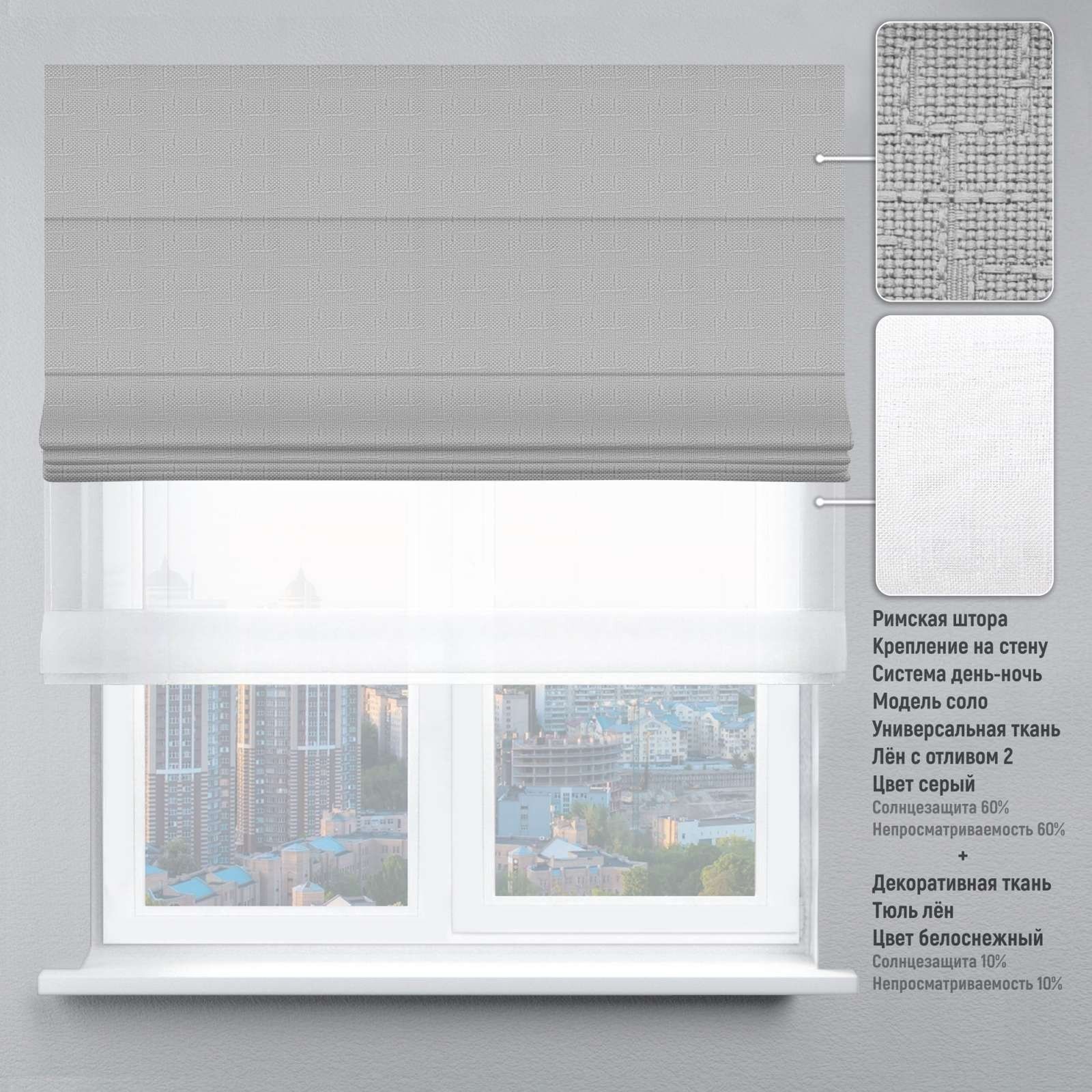 Римська штора День-Ніч Тюль/Льон з відливом сірий