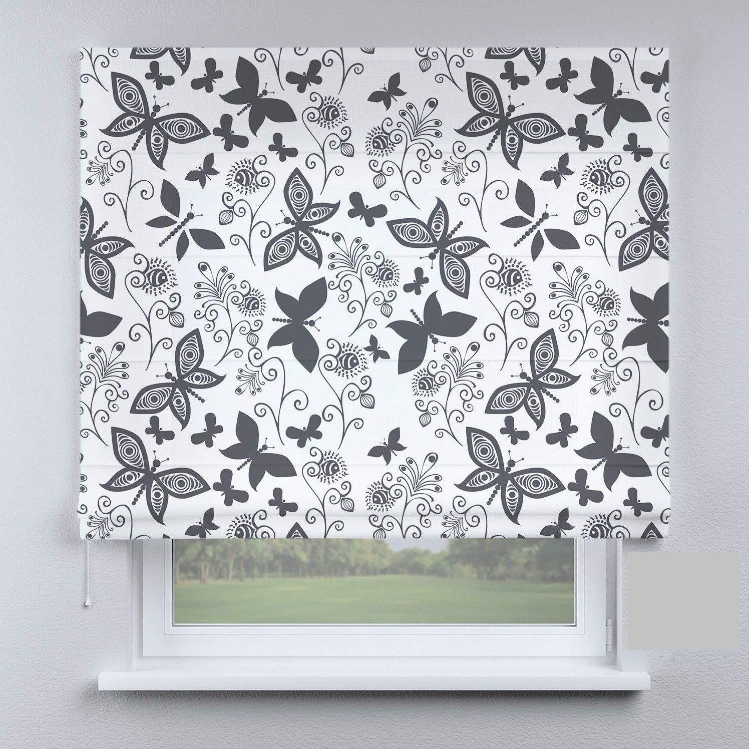 Римська штора з фотодруком метелики з квітами темно-сірі