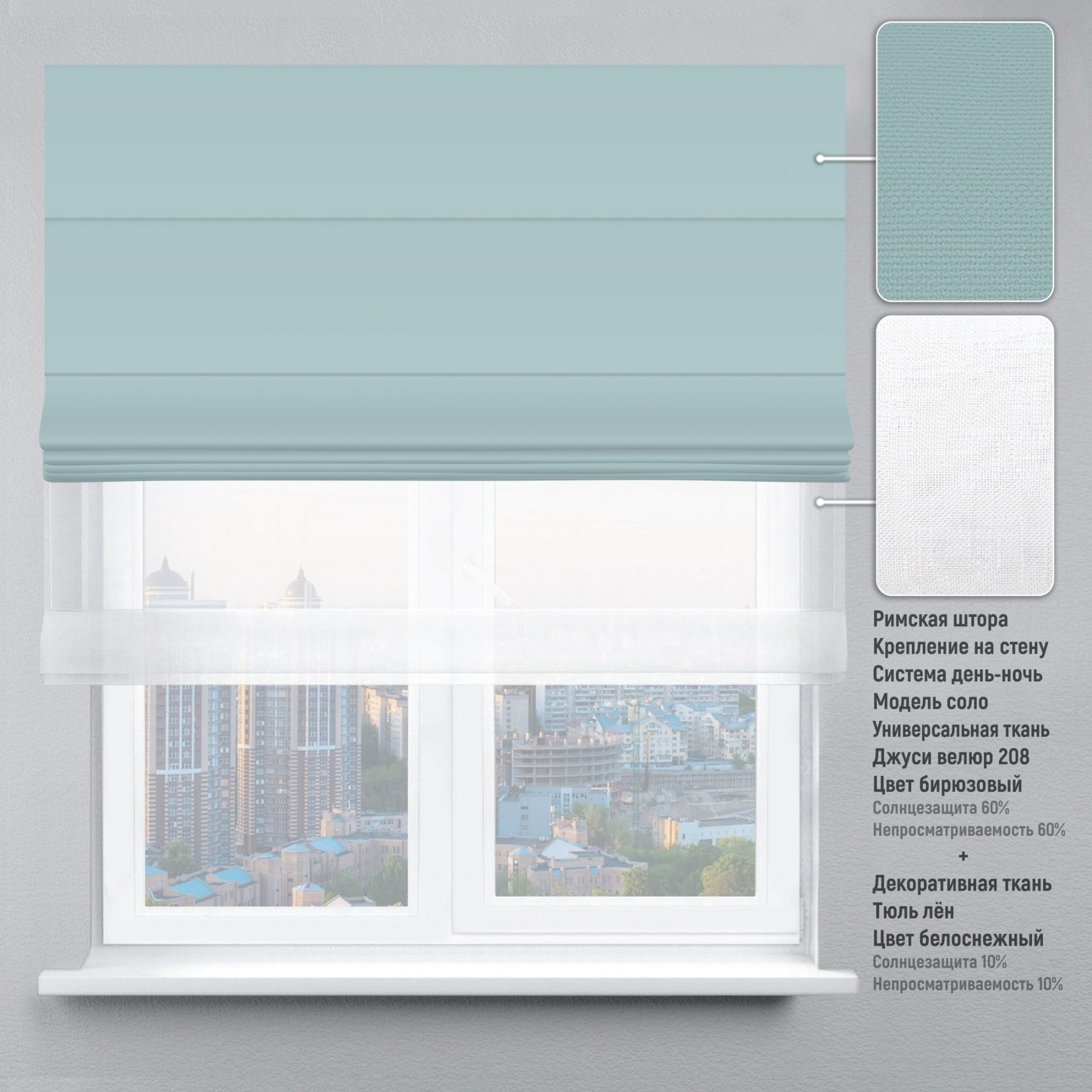 Римська штора День-Ніч Тюль/Велюр із ланцюжковим карнизом бірюзовий