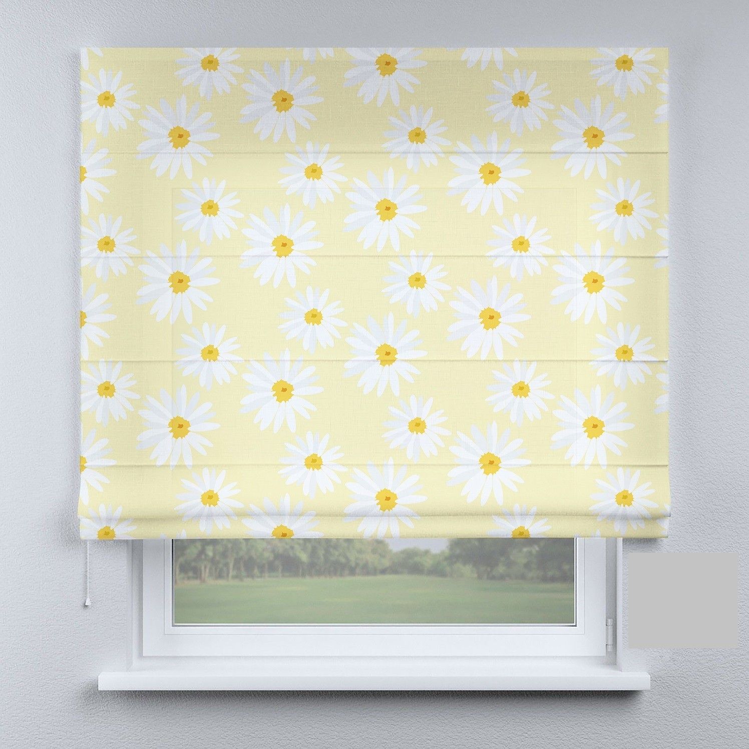 Римська штора з ланцюжковим карнизом ромашки білі на жовтому фоні
