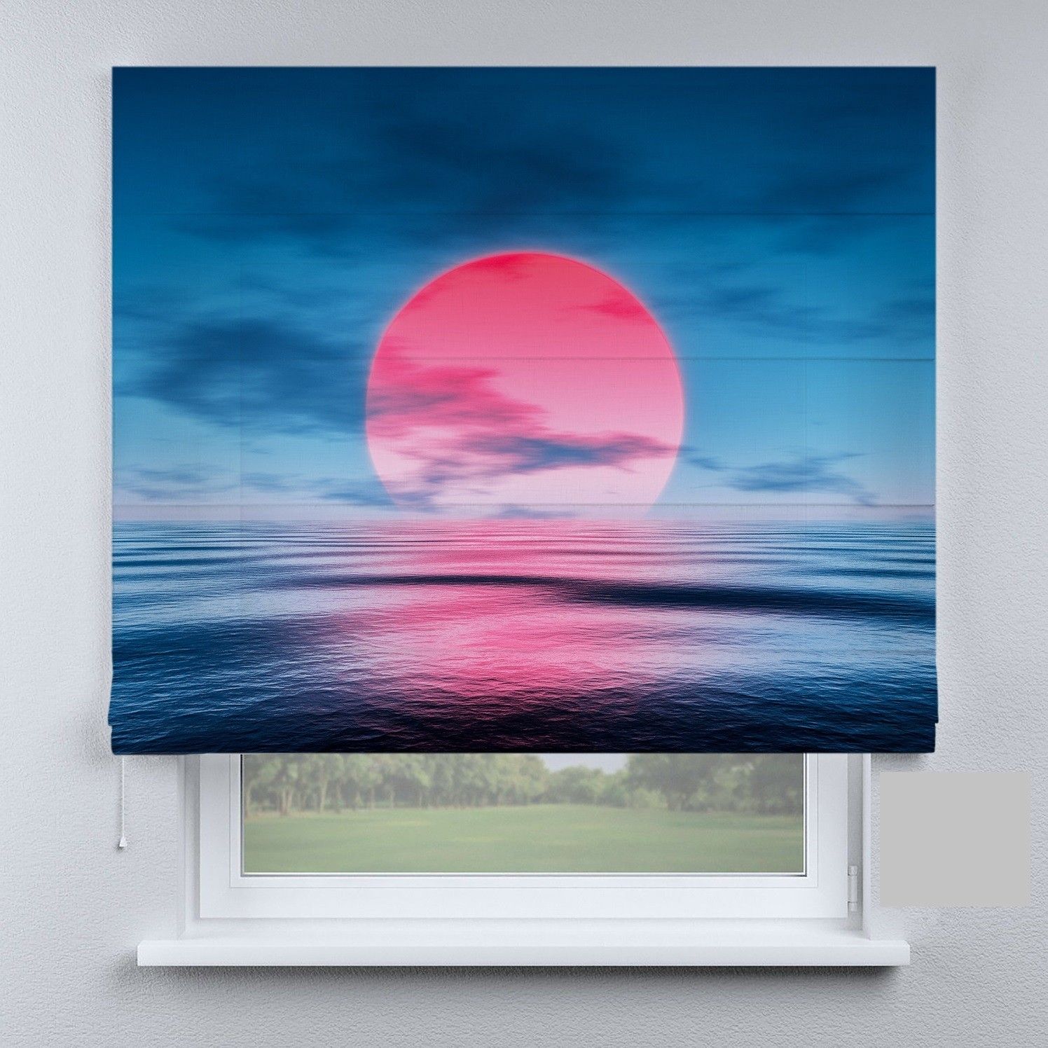 Римська штора з ланцюжковим карнизом захід сонця на синьому фоні