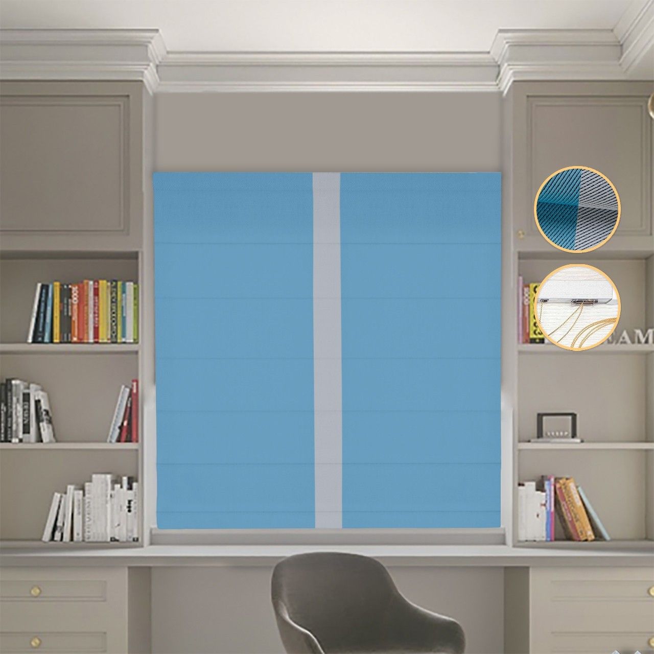Римська штора Блекаут Перфект блакитний з світло-сірим кантом по центру