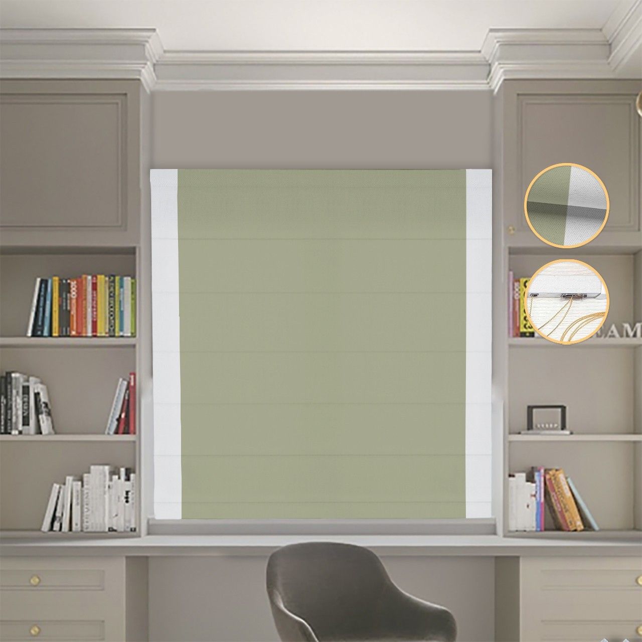 Римська штора Блекаут Нова оливковий з світло-сірими кантами по боках