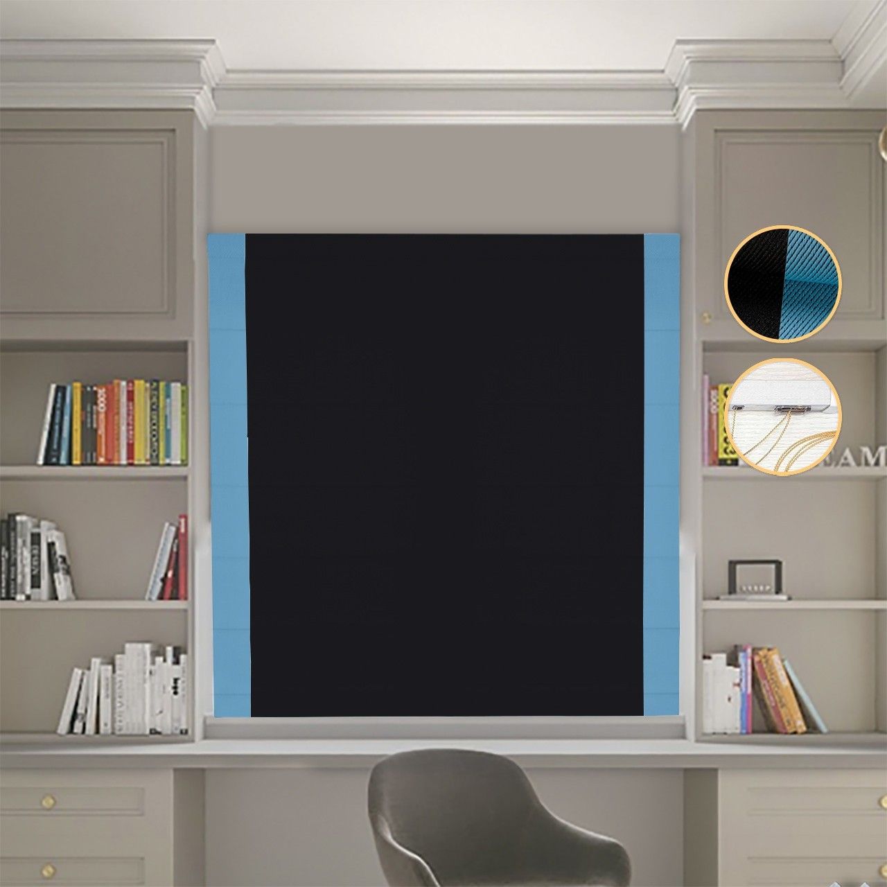 Римська штора DECOLIV Блэкаут Перфект черный с голубыми кантами по бокам