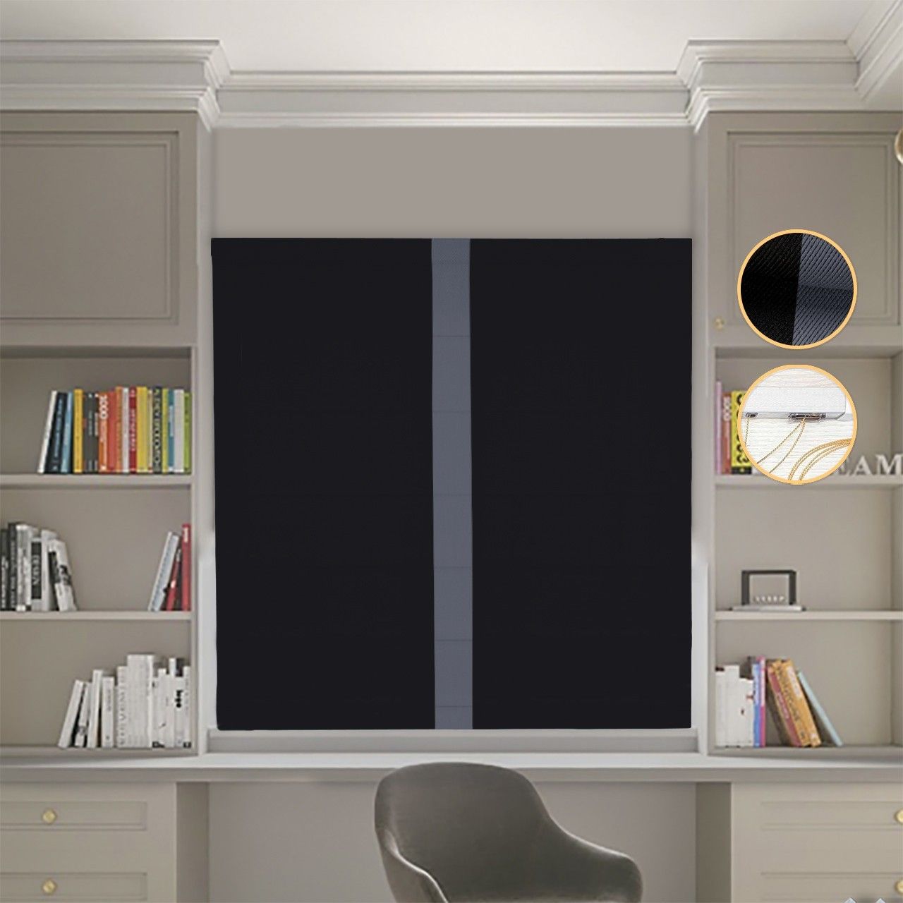 Римська штора DECOLIV Блэкаут Перфект черный с графитовым кантом по центру