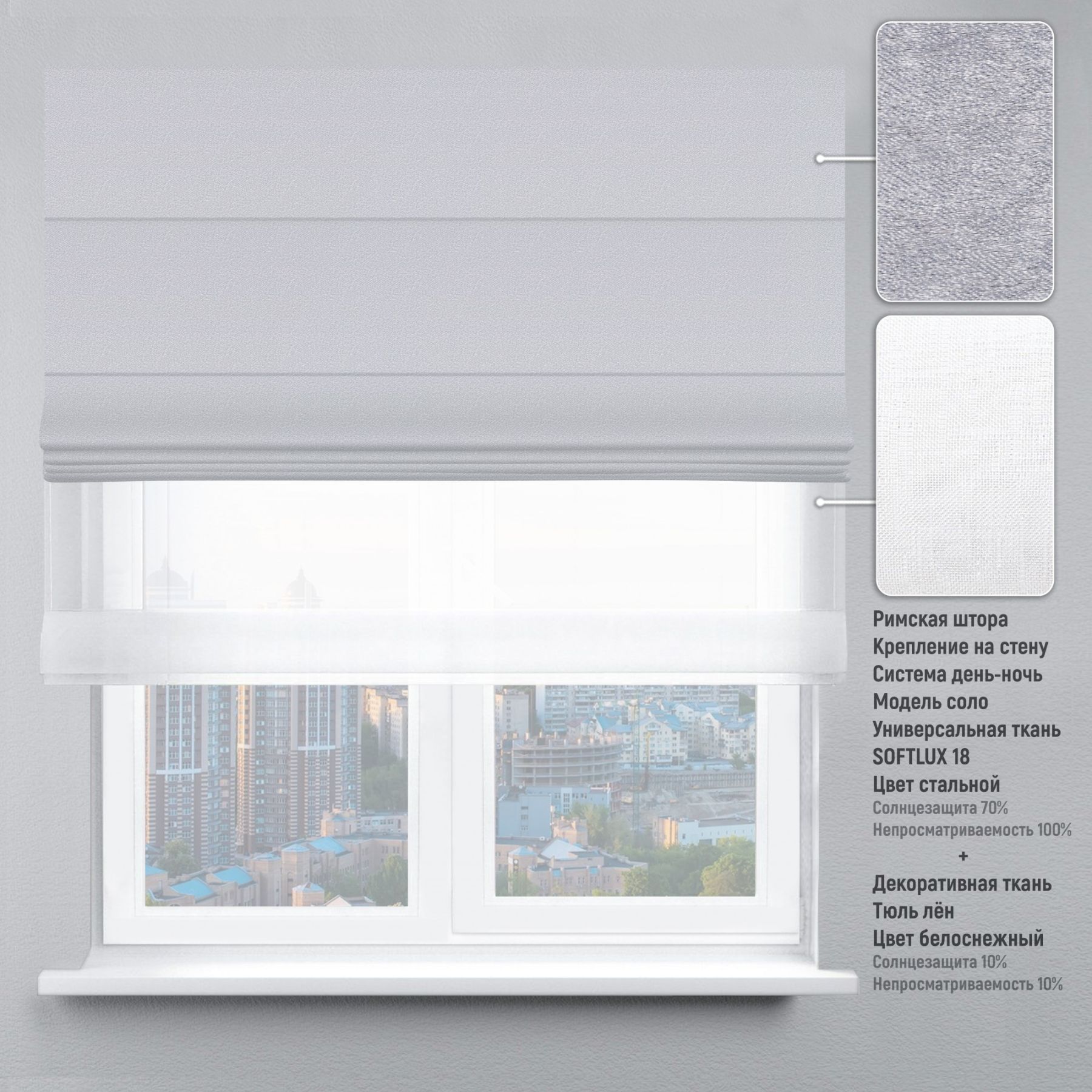 Ткани: для дневного времени – тюлевая, прозрачная ткань, для ночного – плотная (софтлюкс).