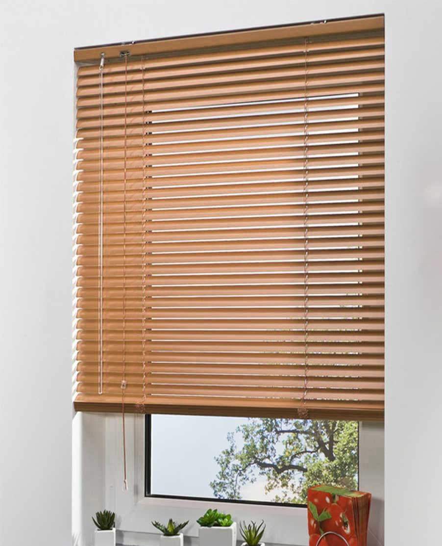 Класичні горизонтальні жалюзи. Карниз і нижній профіль сталеві, Полотно – алюмінієві ламелі. Поєднаний блок підйому-повороту. Підйом здійснюється шнуром, поворот ламелей – пластиковою тростиною.