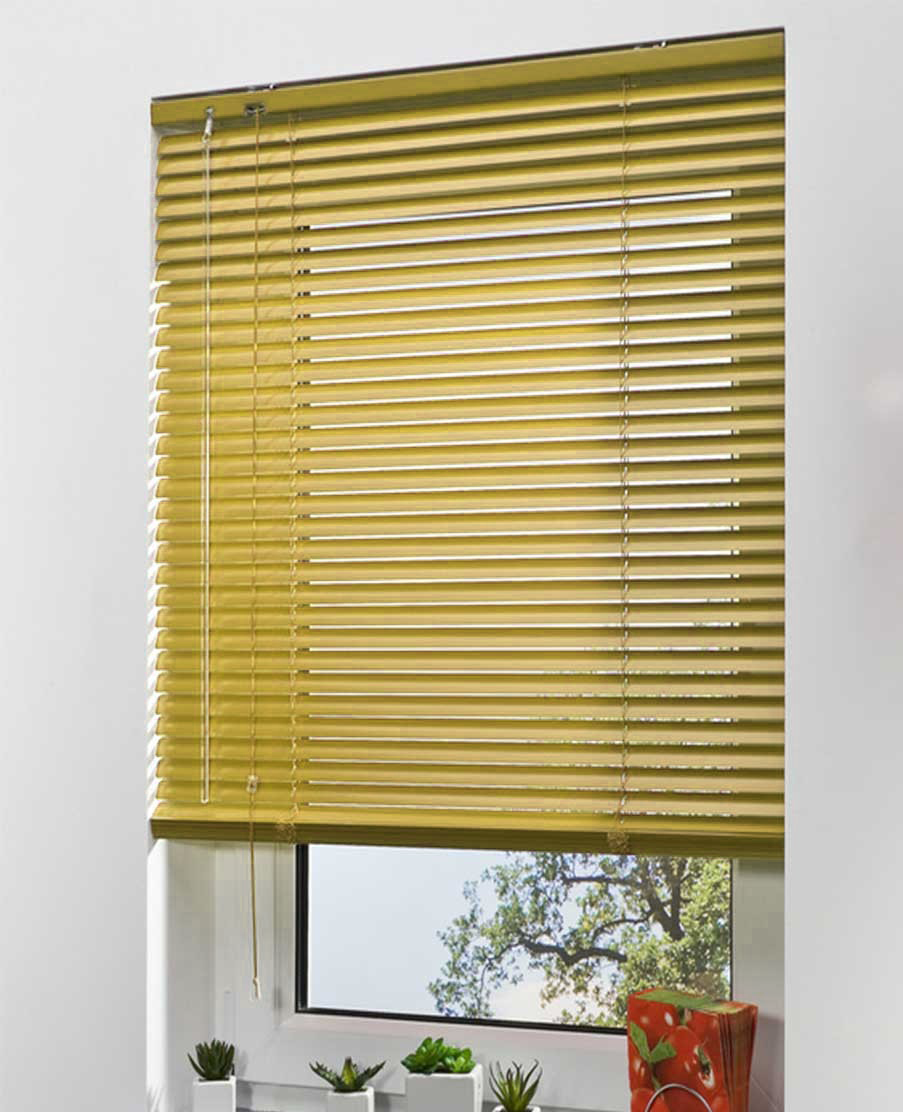 Класичні горизонтальні жалюзи. Карниз і нижній профіль сталеві, Полотно – алюмінієві ламелі. Поєднаний блок підйому-повороту. Підйом здійснюється шнуром, поворот ламелей – пластиковою тростиною.